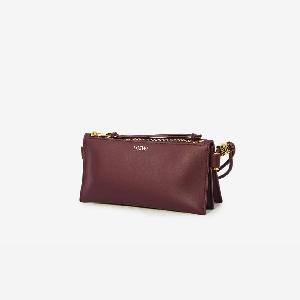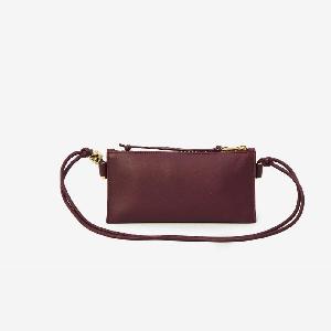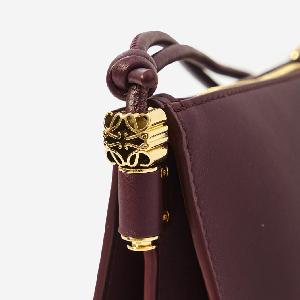 Burgundy calfskin nappa Joya bag. It features a gusset construction, adjustable tubular shoulder strap, metal Anagram detail in gold, LOEWE signature on the front, zip closure with a calfskin zipper pull, one main compartment, and a suede lining.